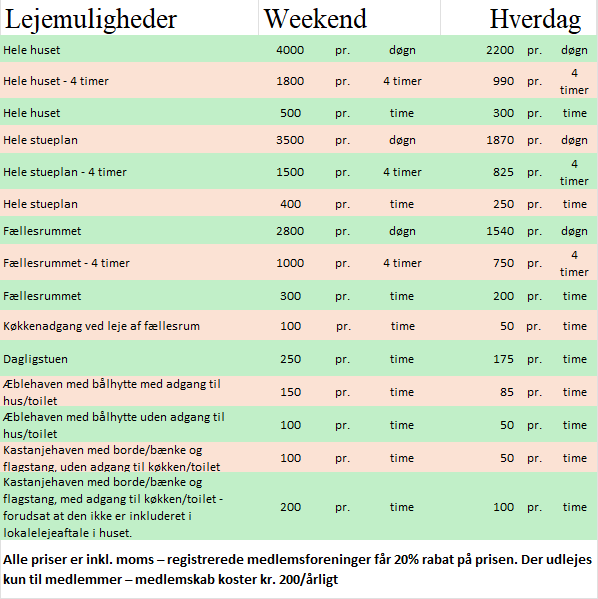 Du meget velkommen til at sende en mail til info@foreningshus.dk hvis du ønsker at leje lokaler i huset eller bålhytten til et arrangement. Husk dog, at vi kun kan leje ud til medlemmer – og er du ikke allerede medlem, kan du hurtigt blive det ved at indbetale medlemskontingent på kr. 200,- til MobilePay 103640